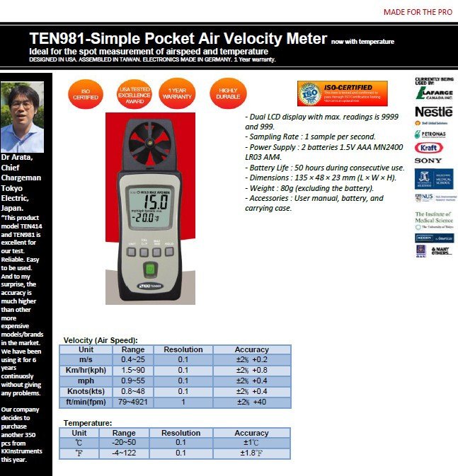 Featured item TEN981 SIMPLE POCKET AIR VELOCITY FPM,M/S METER WITH TEMPERATURE